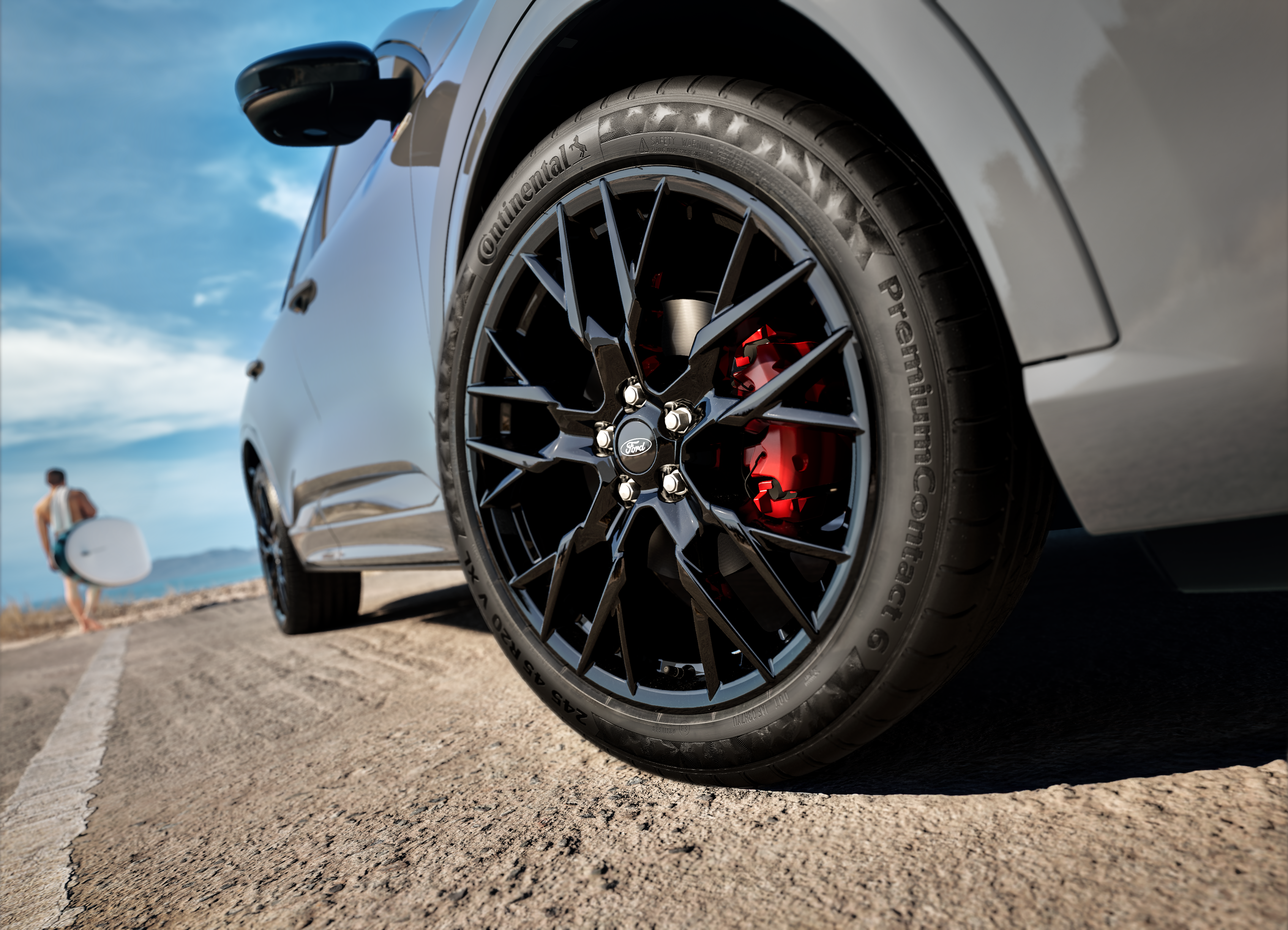 As standard Kuga Black Package features 20-inch Ford Performance alloy wheels finished in black, contrasting with red-painted brake callipers.