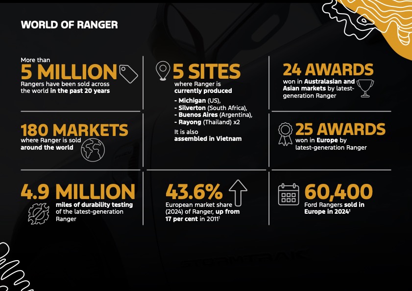 Our team centred in Australia designs and develops the Ford Ranger. We test it in the harshest conditions in the Middle East. We build it in Africa, Asia and North and South America. We sell it in 180 markets worldwide.